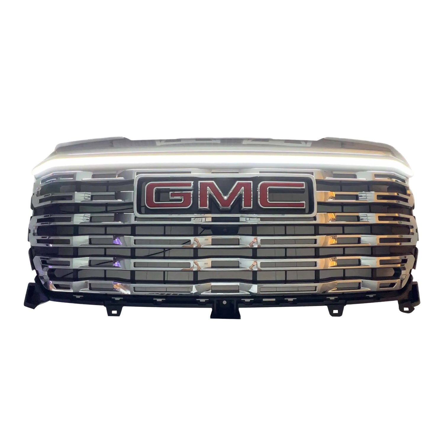 Precision-fit LED grille light bar for 2022–2023 GMC Sierra 1500 AT4, AT4X, SLT, Elevation, Denali, and Denali Ultimate (does not fit SLE or Pro). A 6,500–7,000K white strip follows the grille’s factory contour, adding a crisp DRL glow while keeping the OEM look intact. The IP67-sealed housing is fully water- and dust-proof, with LEDs rated for 50,000 hours of runtime.